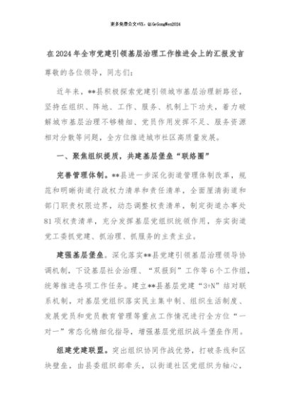 【七哥公文】2024年:在2024年全市党建引领基层治理工作推进会上的汇报发言+更多免费公文+VX:QiGeGongWen2024