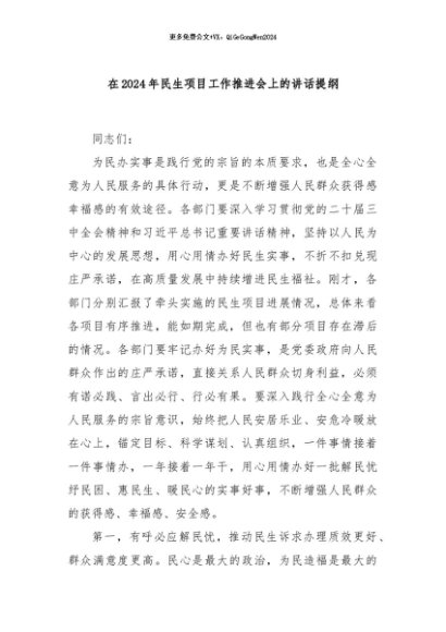 / 【七哥公文】2024年:在2024年民生项目工作推进会上的讲话提纲+更多免费公文+VX:QiGeGongWen2024