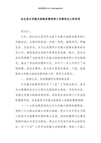 / 【七哥公文】2024年:在全县乡村振兴战略实绩考核工作推进会上的讲话+更多免费公文+VX:QiGeGongWen2024