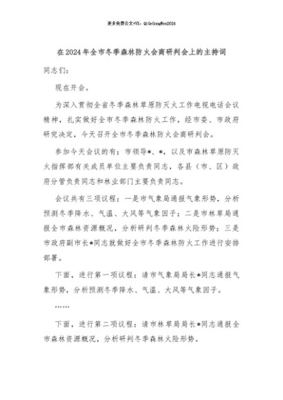 / 【七哥公文】2024年:在2024年全市冬季森林防火会商研判会上的主持词+更多免费公文+VX:QiGeGongWen2024