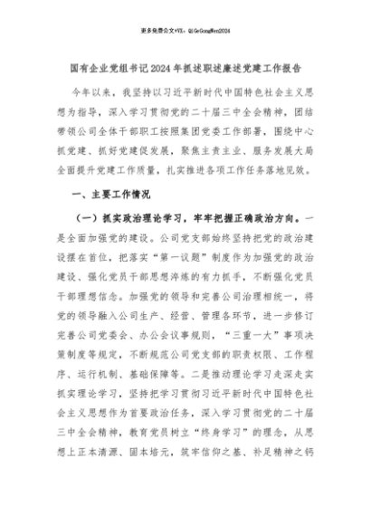 【七哥公文】2024年:国有企业党组书记2024年抓述职述廉述党建工作报告+更多免费公文+VX:QiGeGongWen2024