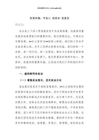 / 【七哥公文】2024年:党课讲稿:守初心 担使命 抓落实+更多免费公文+VX:QiGeGongWen2024