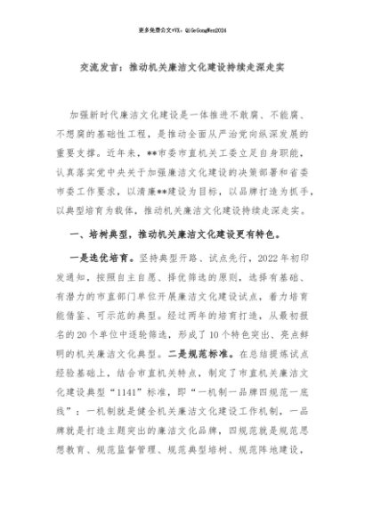 / 【七哥公文】2024年:交流发言:推动机关廉洁文化建设持续走深走实+更多免费公文+VX:QiGeGongWen2024