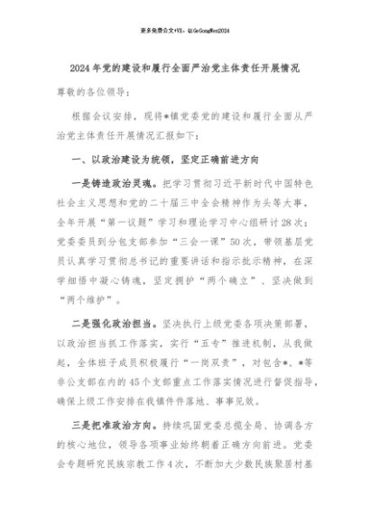 【七哥公文】2024年:2024年党的建设和履行全面严治党主体责任开展情况+更多免费公文+VX:QiGeGongWen2024