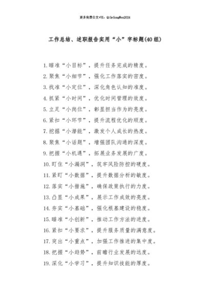【七哥公文】2024年:(40组)工作总结、述职报告实用“小”字标题+更多免费公文+VX:QiGeGongWen2024