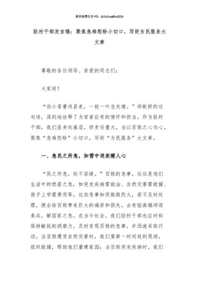 【七哥公文】2024年:驻村干部发言稿:聚焦急难愁盼小切口,写好为民服务大文章+更多免费公文+VX:QiGeGongWen2024