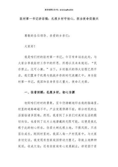 【七哥公文】2024年:驻村第一书记讲话稿:扎根乡村守初心,担当使命促振兴+更多免费公文+VX:QiGeGongWen2024