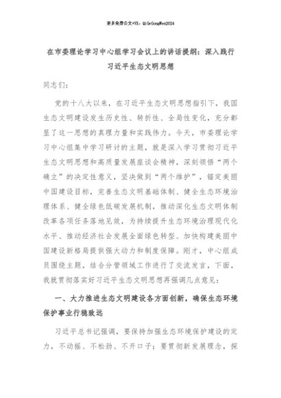 【七哥公文】2024年:在市委理论学习中心组学习会议上的讲话提纲:深入践行习近平生态文明思想+更多免费公文+VX:QiGeGongWen2024