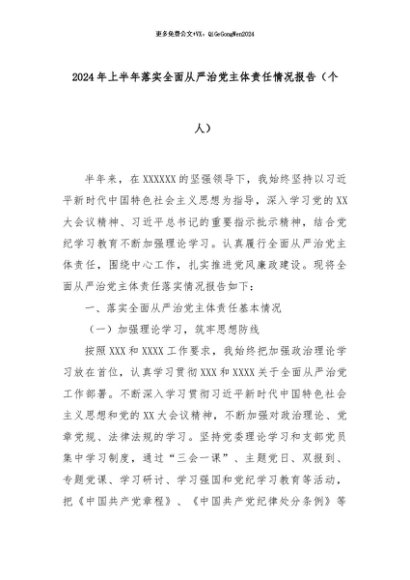 【七哥公文】2024年:2024年上半年落实全面从严治党主体责任情况报告(个人)+更多免费公文+VX:QiGeGongWen2024