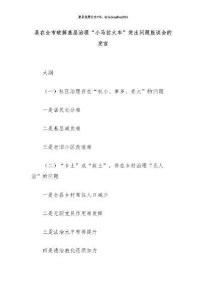 【七哥公文】2024年:县在全市破解基层治理“小马拉大车”突出问题座谈会的发言+更多免费公文+VX:QiGeGongWen2024