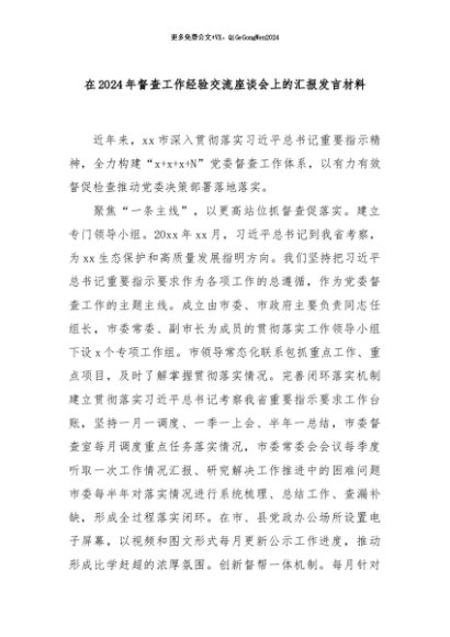 【七哥公文】2024年:在2024年督查工作经验交流座谈会上的汇报发言材料+更多免费公文+VX:QiGeGongWen2024