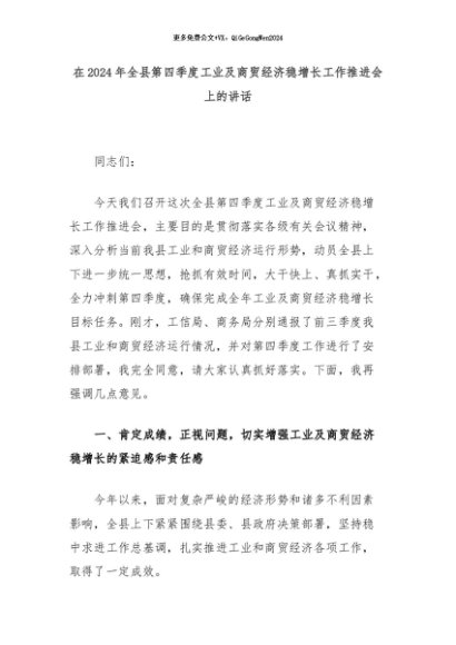 【七哥公文】2024年:在2024年全县第四季度工业及商贸经济稳增长工作推进会上的讲话+更多免费公文+VX:QiGeGongWen2024
