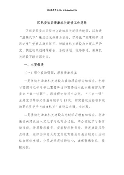 / 【七哥公文】2024年:区纪委监委清廉机关建设工作总结+更多免费公文+VX:QiGeGongWen2024