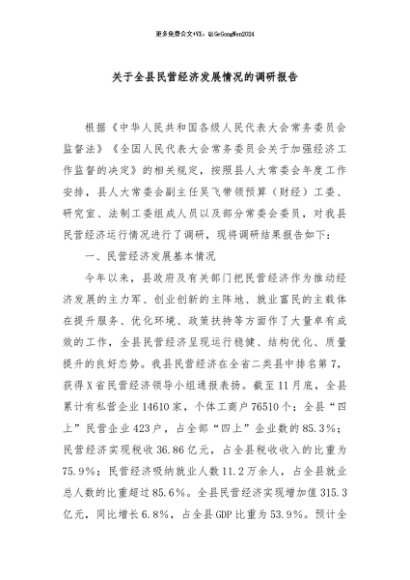 / 【七哥公文】2024年:关于全县民营经济发展情况的调研报告+更多免费公文+VX:QiGeGongWen2024