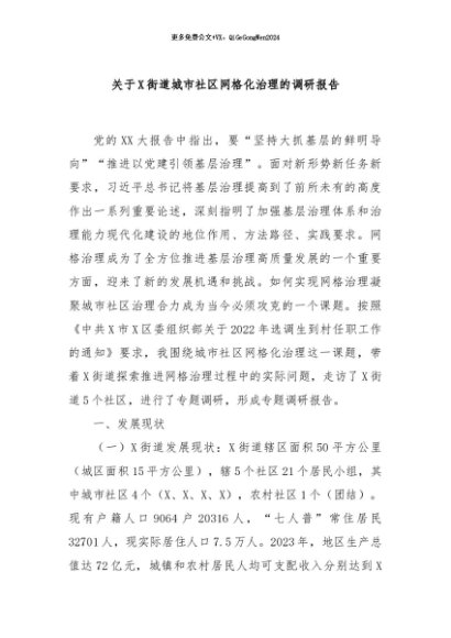 / 【七哥公文】2024年:关于X街道城市社区网格化治理的调研报告+更多免费公文+VX:QiGeGongWen2024
