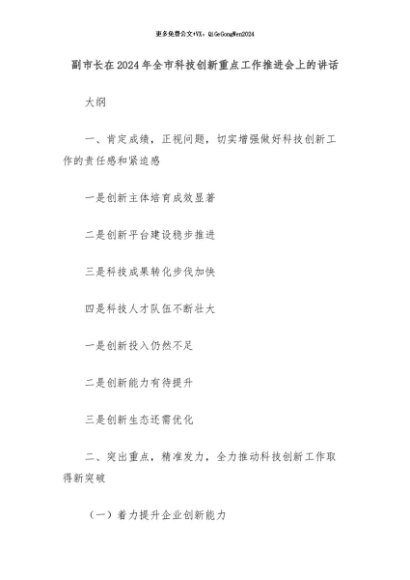 【七哥公文】2024年:副市长在2024年全市科技创新重点工作推进会上的讲话+更多免费公文+VX:QiGeGongWen2024