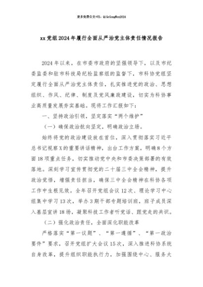 【七哥公文】2024年:xx党组2024年履行全面从严治党主体责任情况报告+更多免费公文+VX:QiGeGongWen2024