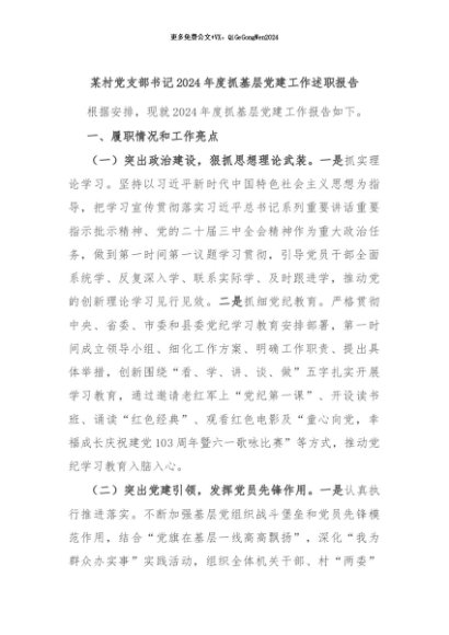 / 【七哥公文】2024年:某村党支部书记2024年度抓基层党建工作述职报告+更多免费公文+VX:QiGeGongWen2024