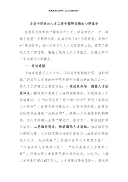/ 【七哥公文】2024年:县委书记参加人才工作专题研讨班的心得体会+更多免费公文+VX:QiGeGongWen2024