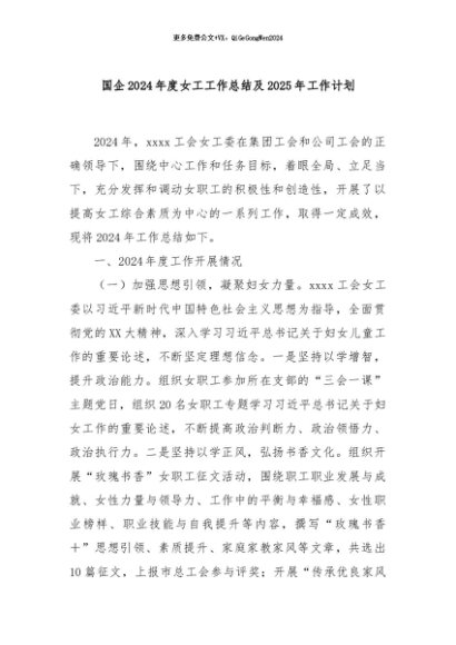 / 【七哥公文】2024年:国企2024年度女工工作总结及2025年工作计划+更多免费公文+VX:QiGeGongWen2024