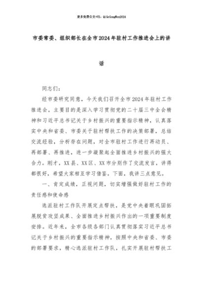 【七哥公文】2024年:市委常委、组织部长在全市2024年驻村工作推进会上的讲话+更多免费公文+VX:QiGeGongWen2024