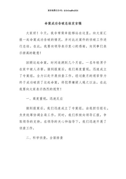 / 【七哥公文】2024年:命案成功告破总结发言稿+更多免费公文+VX:QiGeGongWen2024