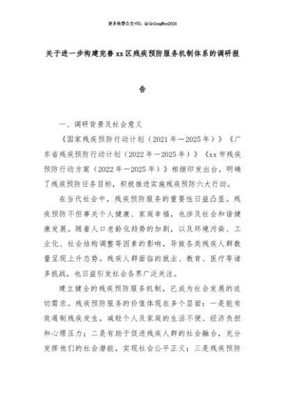 【七哥公文】2024年:关于进一步构建完善xx区残疾预防服务机制体系的调研报告+更多免费公文+VX:QiGeGongWen2024