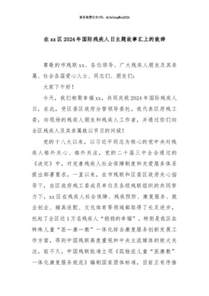 / 【七哥公文】2024年:在xx区2024年国际残疾人日主题故事汇上的致辞+更多免费公文+VX:QiGeGongWen2024