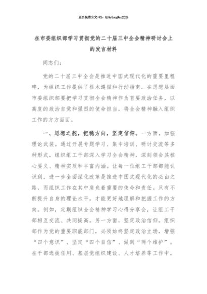 【七哥公文】2024年:在市委组织部学习贯彻党的二十届三中全会精神研讨会上的发言材料+更多免费公文+VX:QiGeGongWen2024