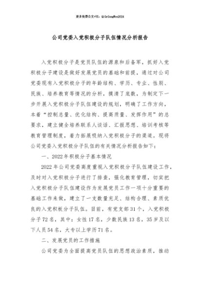 / 【七哥公文】2024年:公司党委入党积极分子队伍情况分析报告+更多免费公文+VX:QiGeGongWen2024