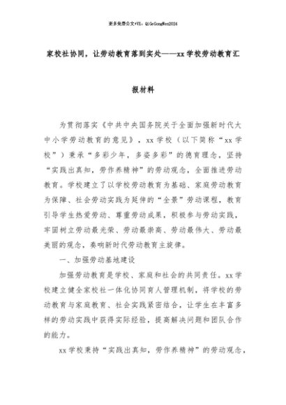 【七哥公文】2024年:家校社协同,让劳动教育落到实处——xx学校劳动教育汇报材料+更多免费公文+VX:QiGeGongWen2024