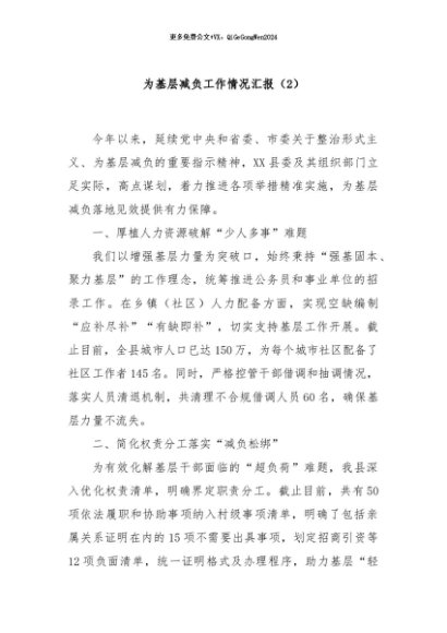 / 【七哥公文】2024年:为基层减负工作情况汇报(2)+更多免费公文+VX:QiGeGongWen2024