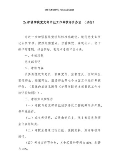 / 【七哥公文】2024年:Xx护理学院党支部书记工作考核评价办法 (试行)+更多免费公文+VX:QiGeGongWen2024