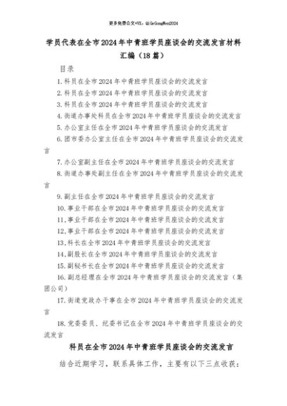 【七哥公文】2024年:(18篇)在全市2024年中青班学员座谈会的交流发言材料汇编+更多免费公文+VX:QiGeGongWen2024