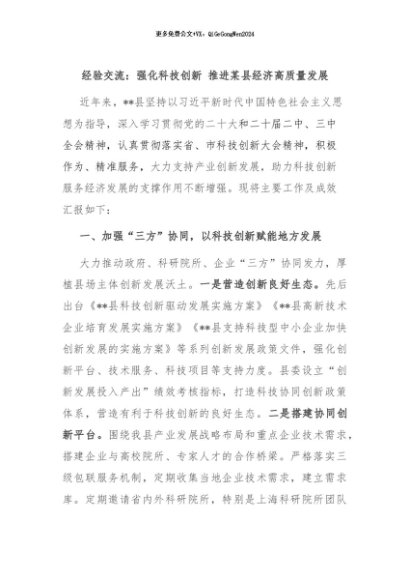 / 【七哥公文】2024年:经验交流:强化科技创新 推进某县经济高质量发展+更多免费公文+VX:QiGeGongWen2024