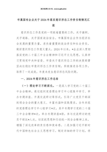 【七哥公文】2024年:市属国有企业关于2024年落实意识形态工作责任制情况汇报+更多免费公文+VX:QiGeGongWen2024