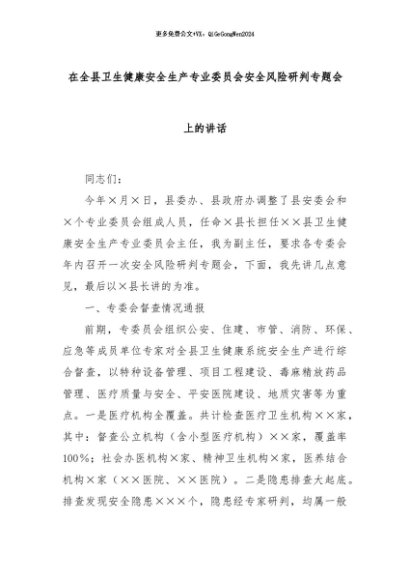 【七哥公文】2024年:在全县卫生健康安全生产专业委员会安全风险研判专题会上的讲话+更多免费公文+VX:QiGeGongWen2024
