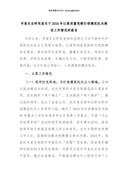 【七哥公文】2024年:市委史志研究室关于2024年以高质量党建引领模范机关建设工作情况的报告+更多免费公文+VX:QiGeGongWen2024