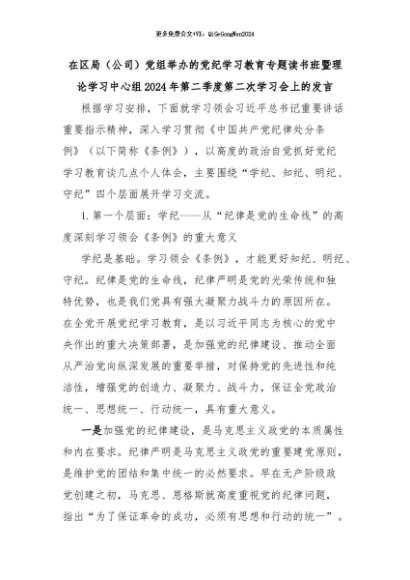 【七哥公文】2024年:在区局(公司)党组举办的党纪学习教育专题读书班暨理论学习中心组2024年第二季度第二次学习会上的发言+更多免费公文+VX:QiGeGongWen2024