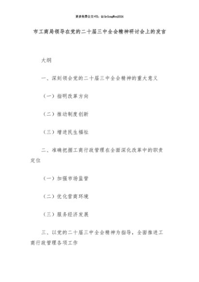 【七哥公文】2024年:市工商局领导在党的二十届三中全会精神研讨会上的发言+更多免费公文+VX:QiGeGongWen2024