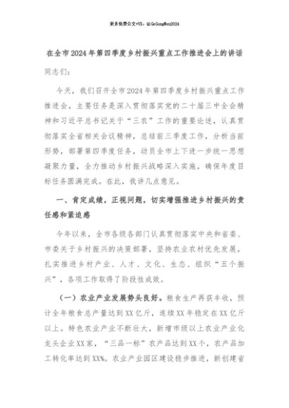 【七哥公文】2024年:在全市2024年第四季度乡村振兴重点工作推进会上的讲话+更多免费公文+VX:QiGeGongWen2024