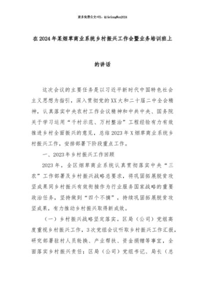 【七哥公文】2024年:在2024年某烟草商业系统乡村振兴工作会暨业务培训班上的讲话+更多免费公文+VX:QiGeGongWen2024