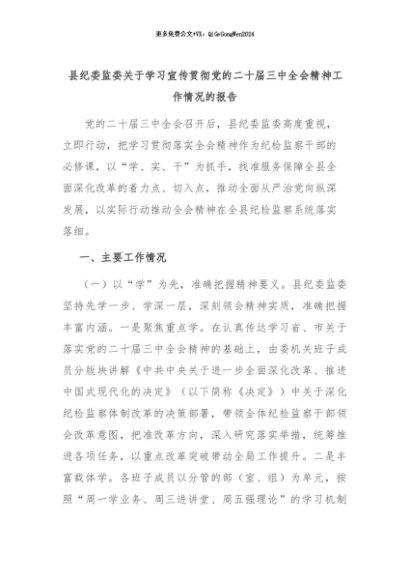 【七哥公文】2024年:县纪委监委关于学习宣传贯彻党的二十届三中全会精神工作情况的报告+更多免费公文+VX:QiGeGongWen2024