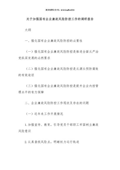 / 【七哥公文】2024年:关于加强国有企业廉政风险防控工作的调研报告+更多免费公文+VX:QiGeGongWen2024