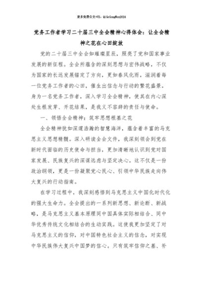 【七哥公文】2024年:党务工作者学习二十届三中全会精神心得体会:让全会精神之花在心田绽放+更多免费公文+VX:QiGeGongWen2024
