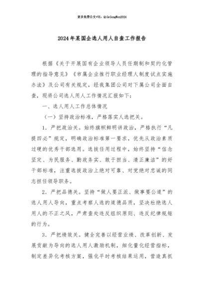 / 【七哥公文】2024年:2024年某国企选人用人自查工作报告+更多免费公文+VX:QiGeGongWen2024