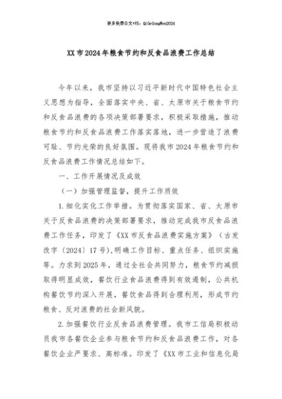 / 【七哥公文】2024年:XX市2024年粮食节约和反食品浪费工作总结+更多免费公文+VX:QiGeGongWen2024