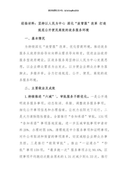 【七哥公文】2024年:经验材料:坚持以人民为中心 深化“放管服”改革 打造规范公开便民高效的政务服务环境+更多免费公文+VX:QiGeGongWen2024