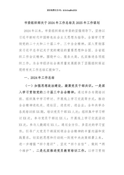 【七哥公文】2024年:市委组织部关于2024年工作总结及2025年工作谋划+更多免费公文+VX:QiGeGongWen2024