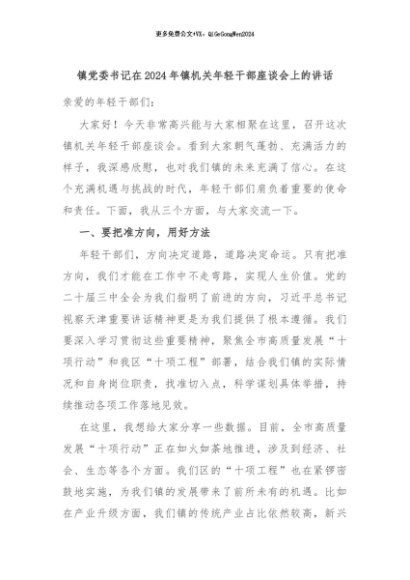【七哥公文】2024年:镇党委书记在2024年镇机关年轻干部座谈会上的讲话+更多免费公文+VX:QiGeGongWen2024